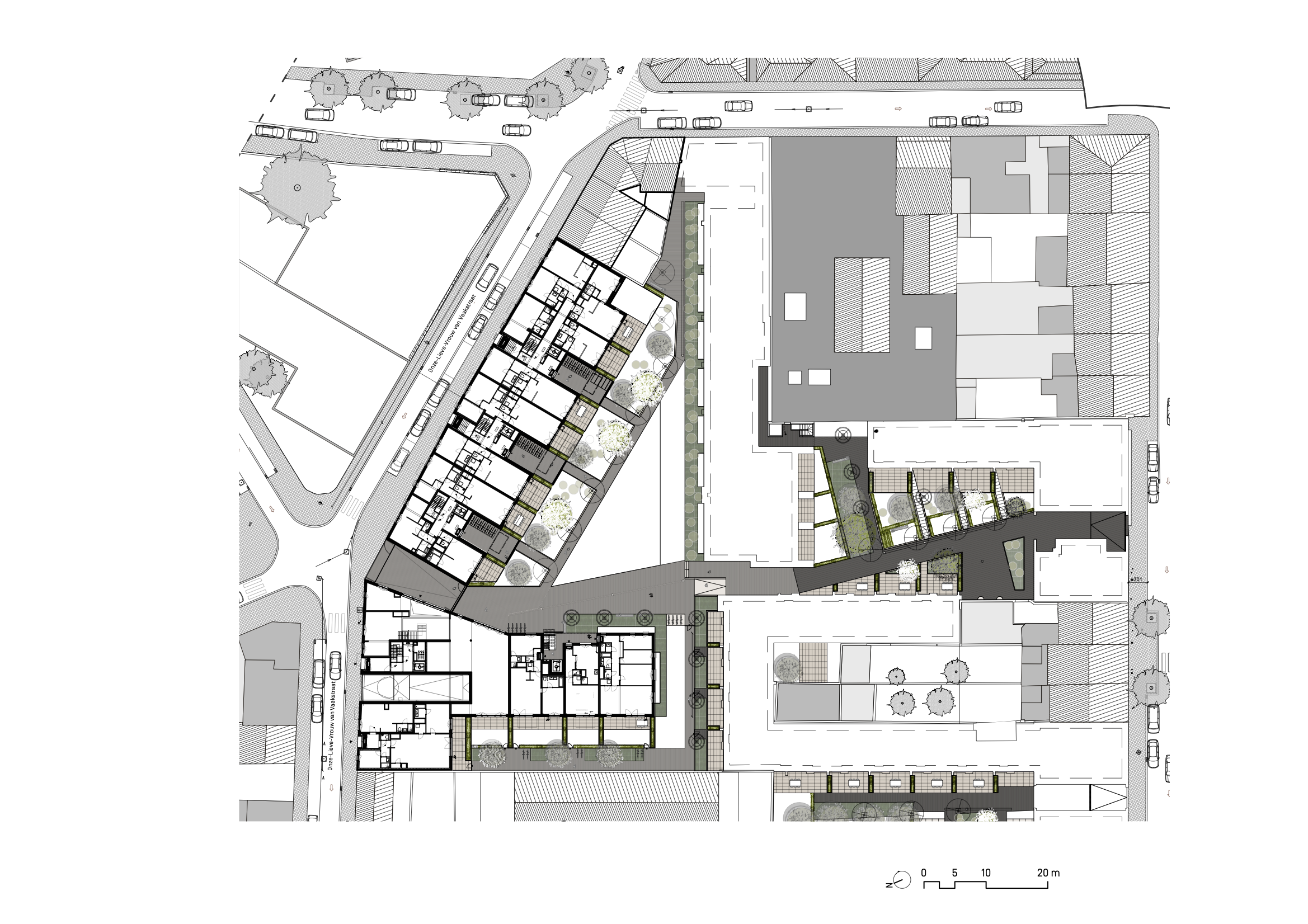 A bird’s eye view of the block offers insight into the great variety of existing built forms present: imposing industrial roofs of all shapes and sizes, small sloped roofs of working class housing, high ‘hollow-toothed ’chimneys … The project slips into this aerial kaleidoscope through its own hop-scotch of roofs: flat or sloped, with or without terraces carved in, covered in natural zinc or green and planted, … each particular geometry contributing to the bigger recognizable picture.